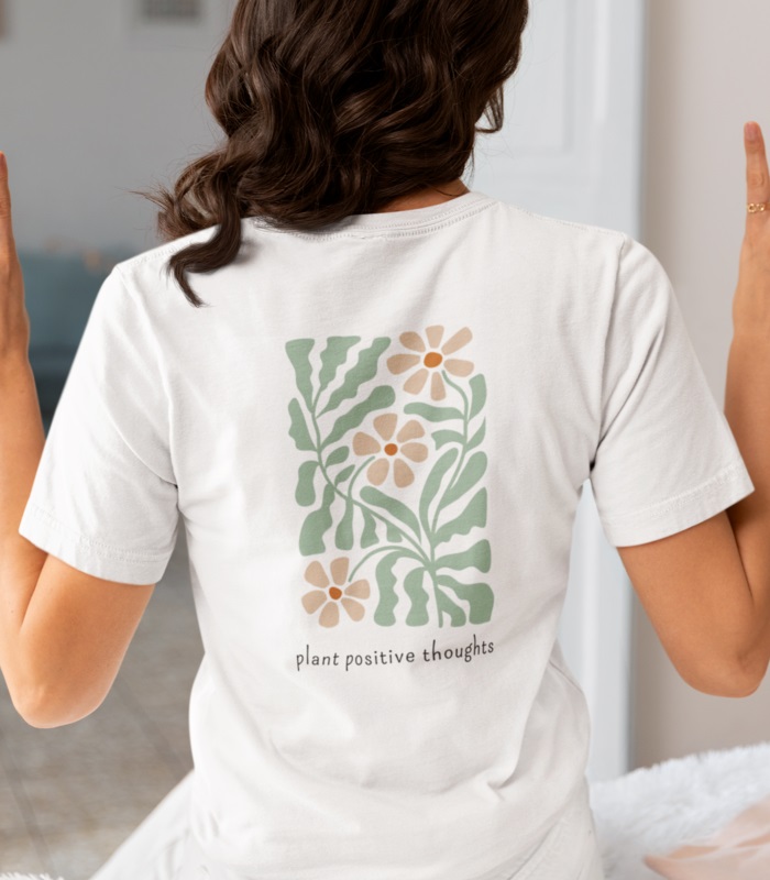 Strahle positive Energie aus mit unserem „Plant Positive Thoughts“ T-Shirt! Das stilvolle Design mit Blumenmotiv erinnert dich daran, deine Gedanken bewusst zu wählen. Mit seinem schmeichelhaften V-Ausschnitt und weichem Stoff ist es perfekt für jeden Tag.
