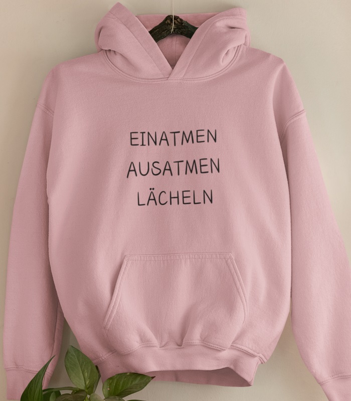 Dieser Hoodie erinnert dich daran, im Alltag innezuhalten und zu entspannen. Mit dem Aufdruck „Einatmen Ausatmen Lächeln“ strahlst du Gelassenheit aus und teilst positive Vibes mit deiner Umgebung.