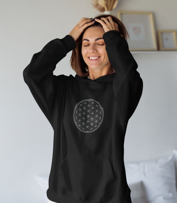 Die Blume des Lebens auf diesem Hoodie symbolisiert Einheit und Balance. Perfekt für alle, die sich mit positiver Energie umgeben und ein zeitloses, bedeutungsvolles Design tragen möchten